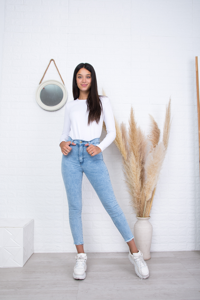 Tiro- Alto Bolsillo- Ciego Botamanga- RUEDO Hilo- Azul Tela- jean elastizado LA MODELO MIDE 1.70 Y VISTE UN TALLE 36